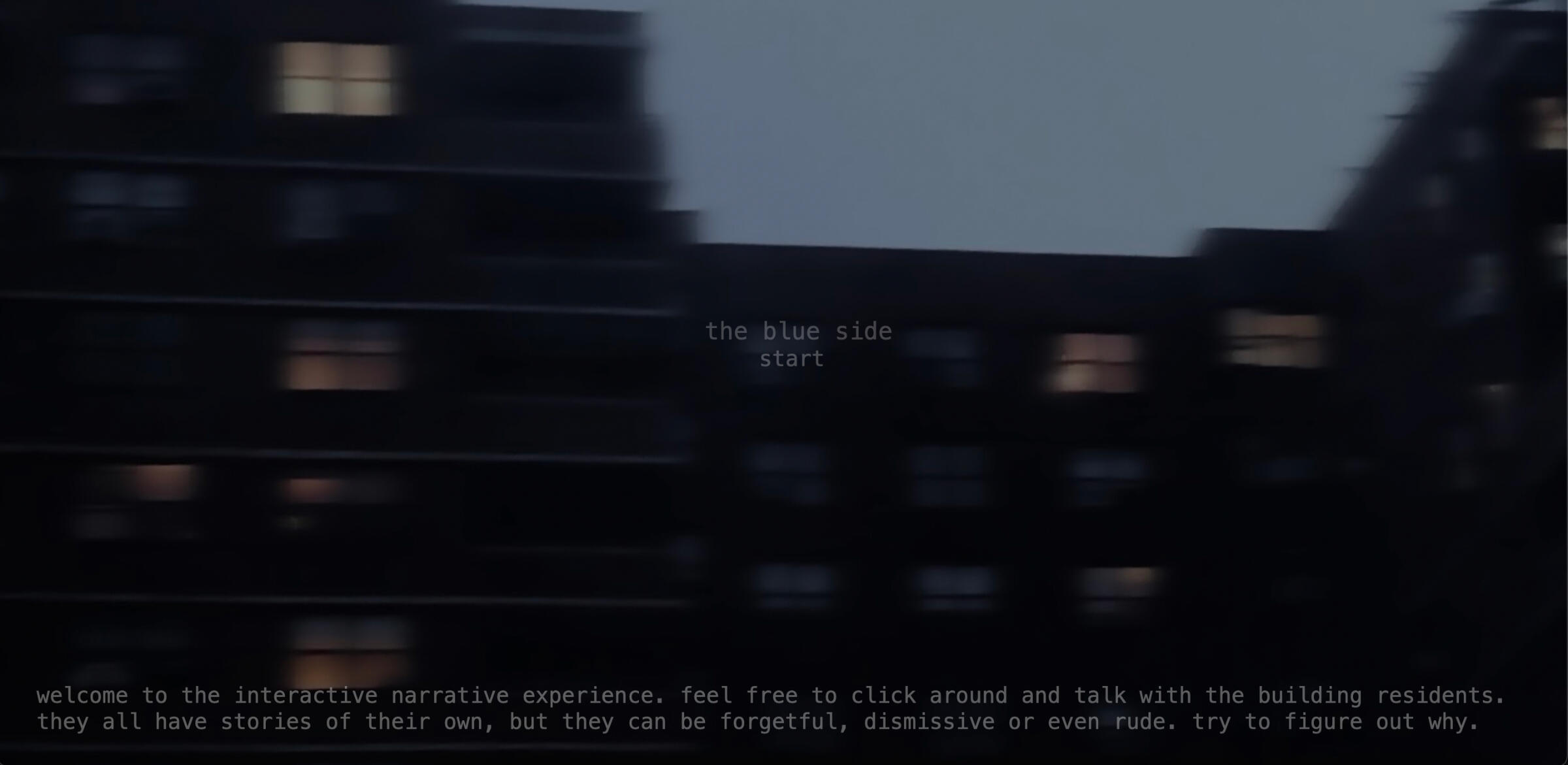 Link to website: http://142.93.248.217/This project is called The Blue Side and it is a website based on characters and their interactivity with the users. It includes themes of evolving technology, untold stories and the rising dependency that people have on technology. I designed a live interface of a building with several tenants that the user can interact with using chat bots with premeditated responses. The elevator pitch is, “A project that shows the importance of preserving and retelling stories with artificial intelligence, creating a general archive for future reference.”On the technical side, I designed and hosted the website with HTML, CSS and JavaScript. It lives as a design website hosted on a public server on Digital Ocean. Each character prompts the user to have a conversation with them so that they can relay their individual stories. Once the user exits the building, they can read and add their own anonymous story to the story board. Therefore, this website acts as an archive of stories that might be lost some day. I wanted to make this project to highlight the importance of storytelling and how important it is to preserve the stories that are passed down the family tree and across the tree to acquaintances. The target audience is anyone and everyone that is ready to read and write about unique experiences and characters.
