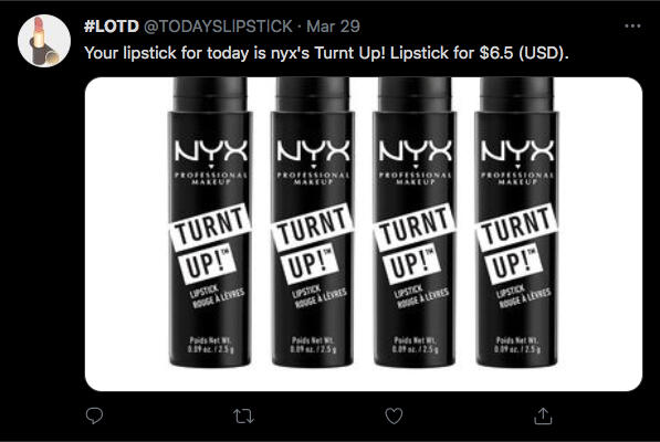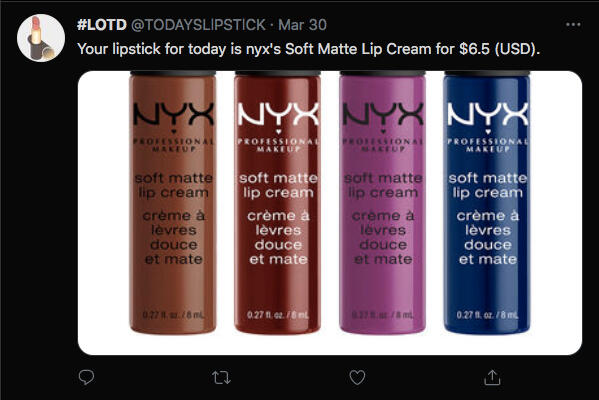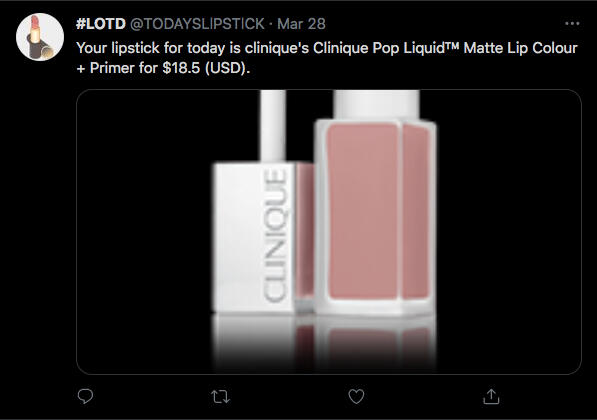Link to Twitter page for the bot: https://twitter.com/TODAYSLlPSTlCKFor this project, I made a Twitter bot that tweets a picture of a different lipstick everyday from an API, and deployed it using Heroku. The code is on Github, and the pictures are some of the example posts.