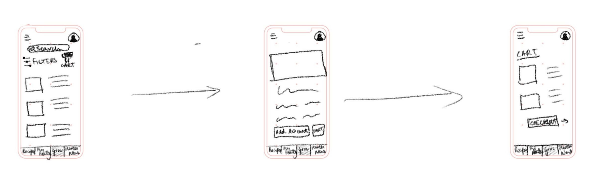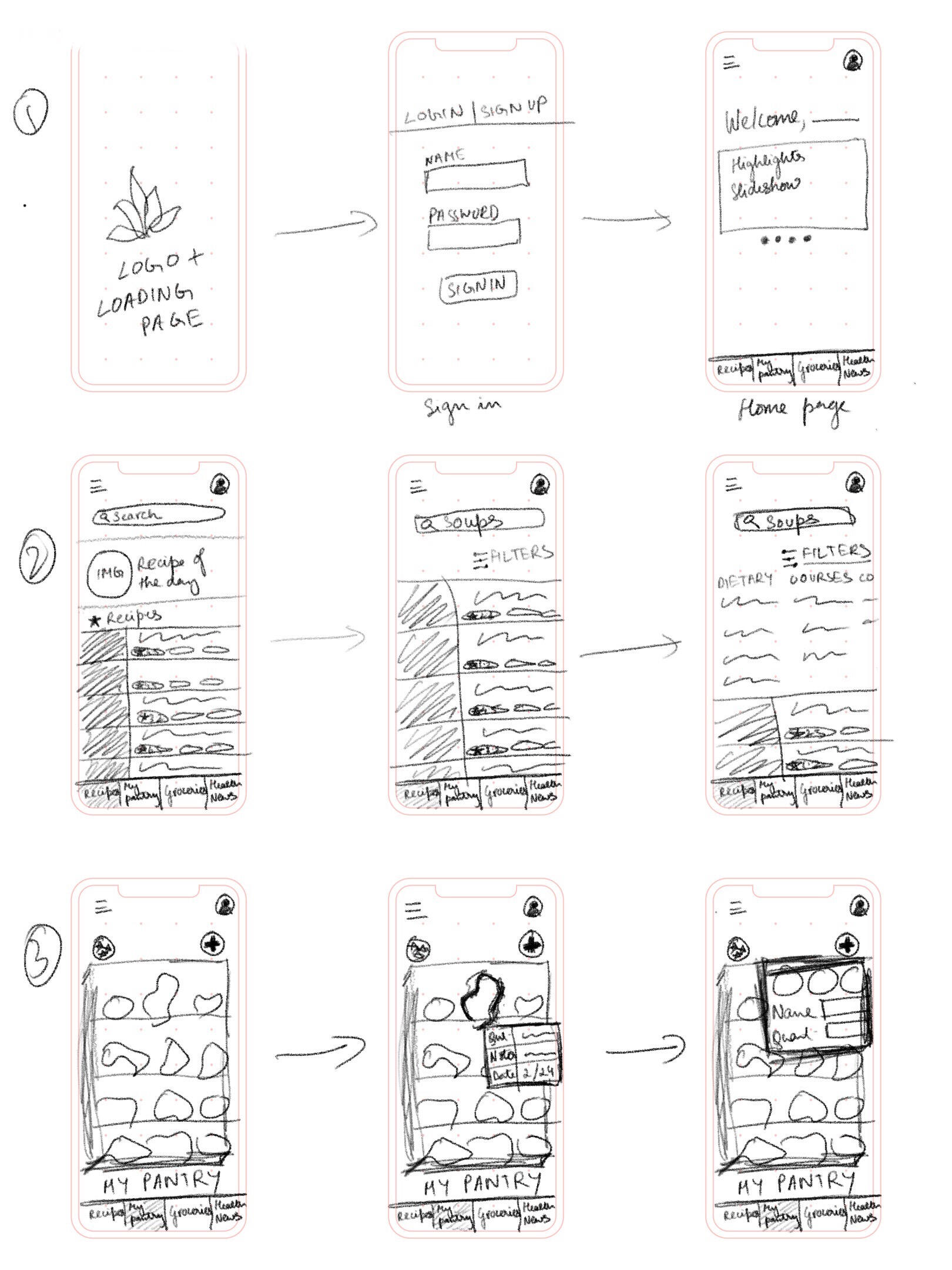I also conducted three guerrilla style design interviews with these sketches, where the user was asked to browse through these pages and figure out what it could be used for. Most of the results were that of a grocery style app that helps you organize your pantry and reduce wastage.At this point, I was wireframing these designs digitally with Figma so that I have a working prototype. Some of the questions I wanted to tackle further were: