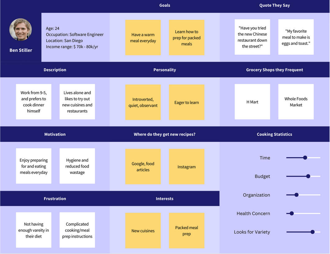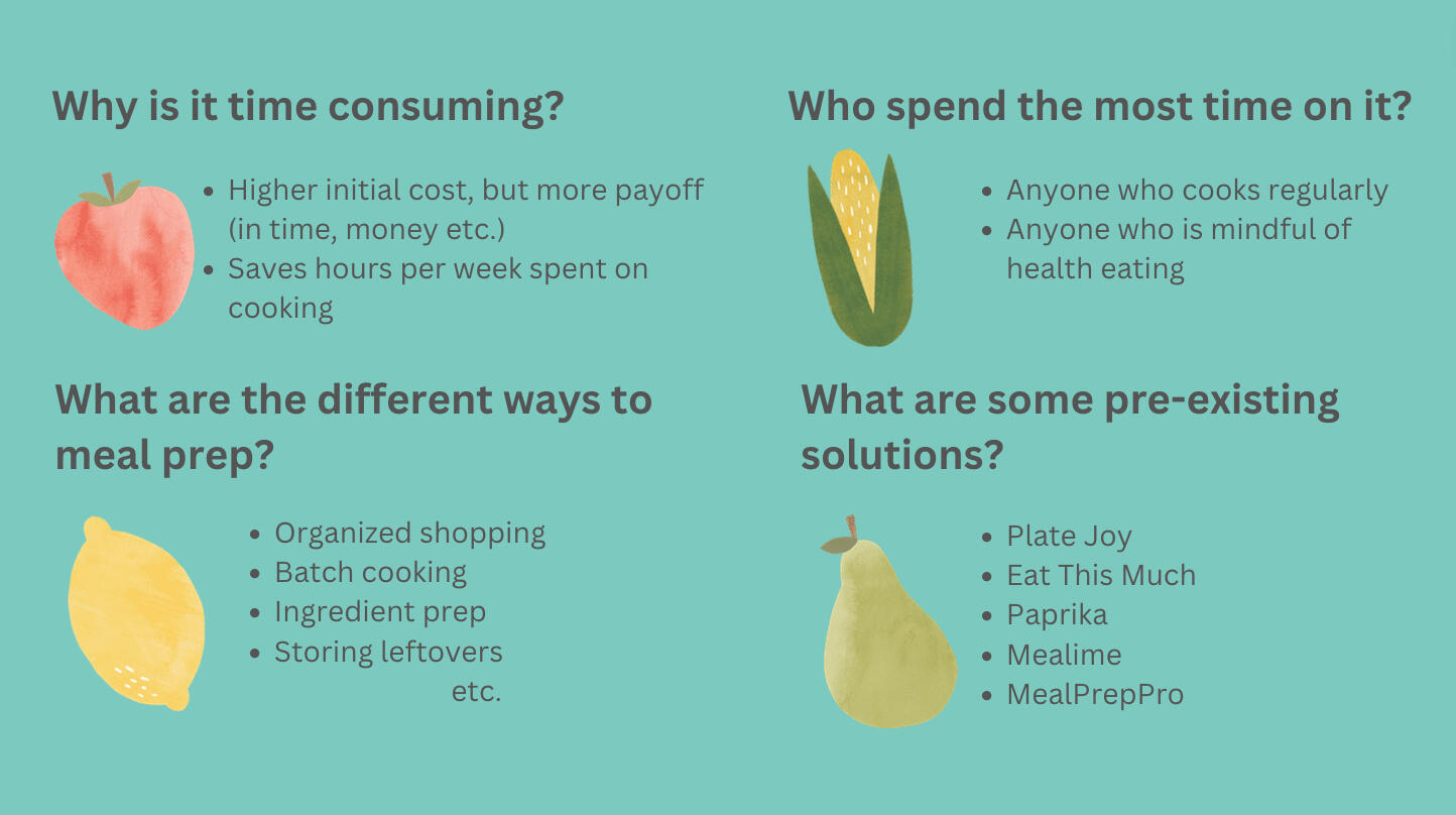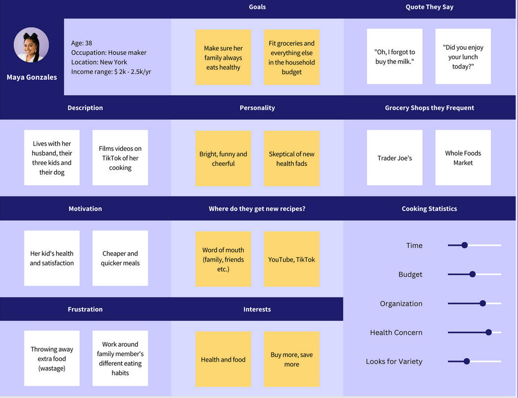 " People who cook every day for themselves and their family have no way to organize the household's groceries, meals and eating habits. They worry about overspending on food, and struggle to make meal prep a regular part of their schedule because they don't know how to do it quickly and efficiently. "