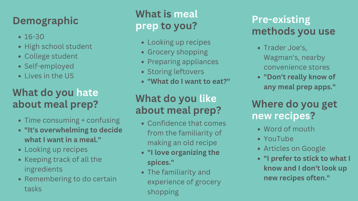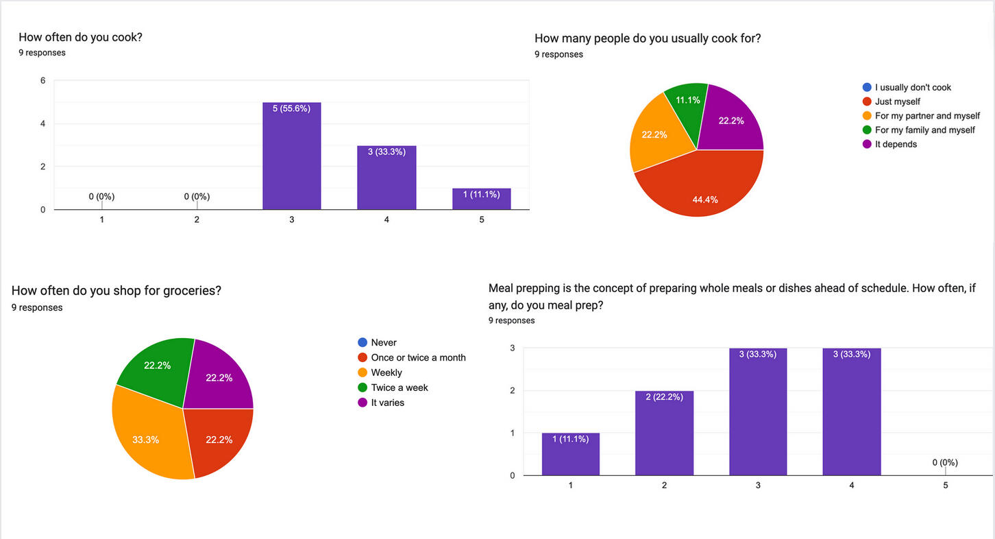 For the qualitative research, I conducted a batch of one-to-one interviews which helped me gain a deeper understanding of the user’s thought process behind meal prepping. I recruited these candidates through the form I sent out, and interviewed them for 30 minutes each. Some of my key findings were:
