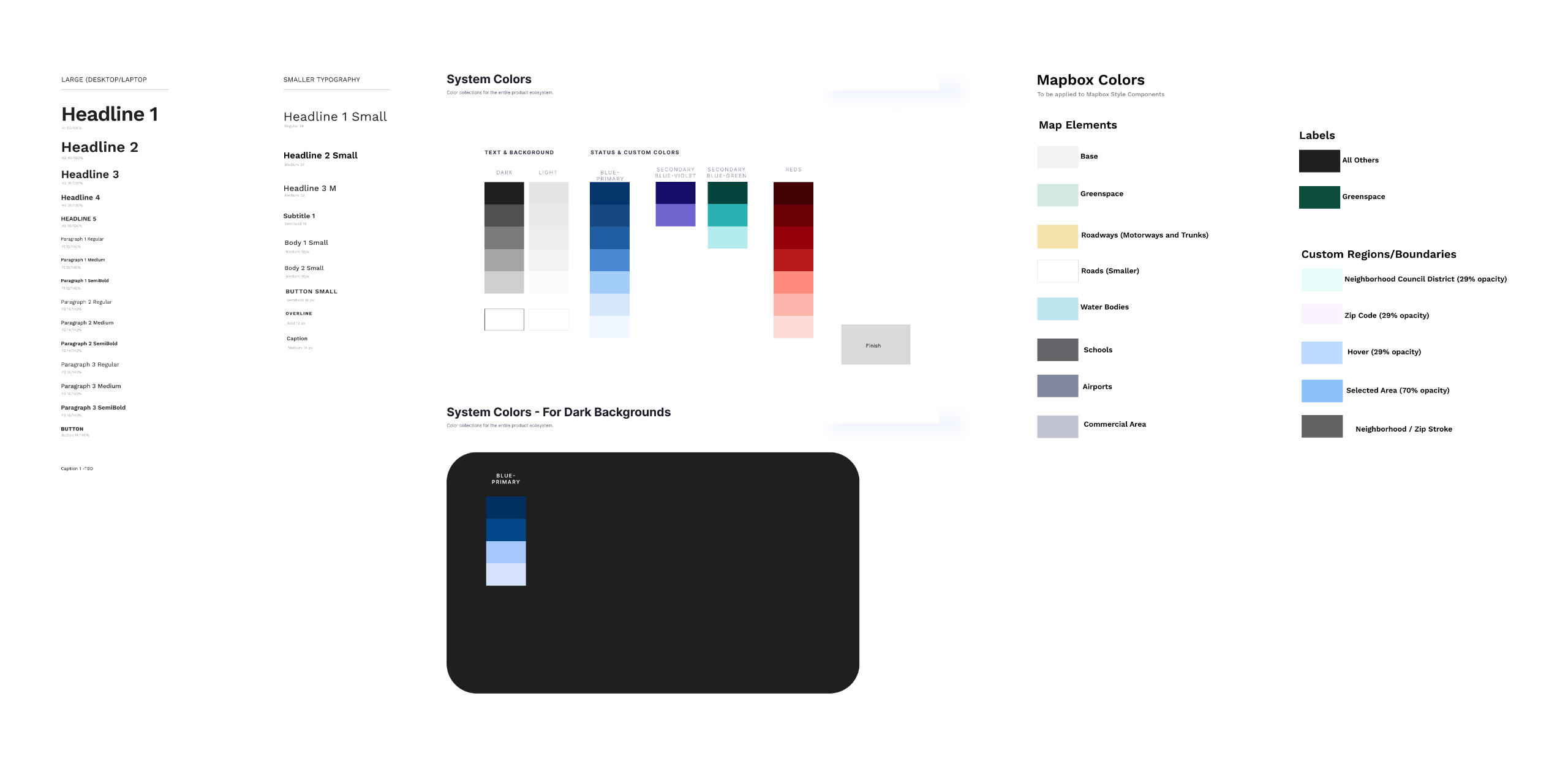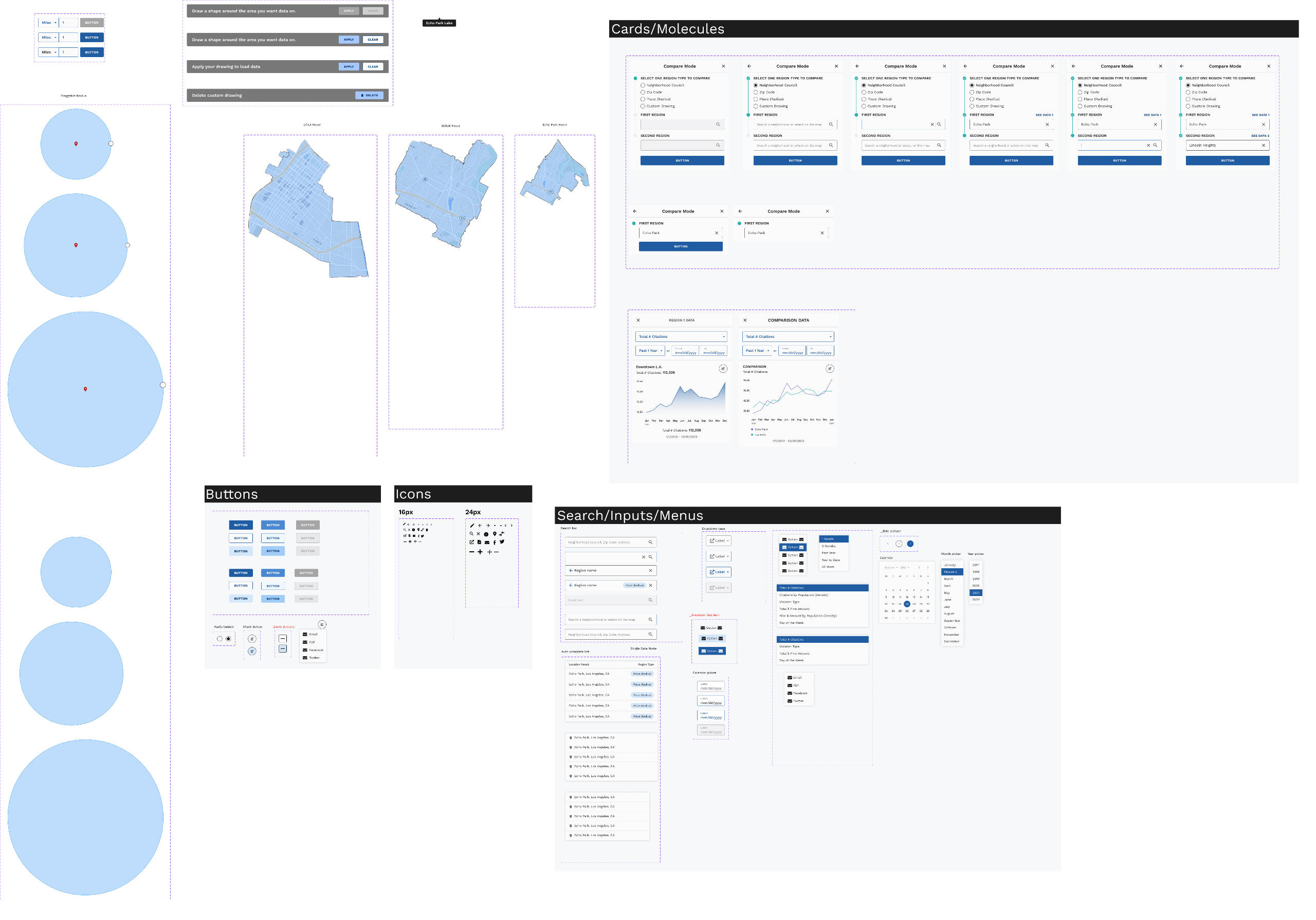 This is a link to the low-fi version prototype on Figma.In the mid-fi version, we created the empathy map from some more user-testing, and brushed up a few of the functionalities including adding a user input option to the radius of the drawing mode on the map, changing the date picker so it's smoother, adding and testing ideas for the landing page, and making a few of the UI components.Now, it was time to make the high-fi mockups. We used Mapsicle, which is a free Figma plug-in, to add the map of LA to our mock-ups. We also set up a responsive grid in-case this project was taken to a hand-held device, and made a style guide that looked like this.