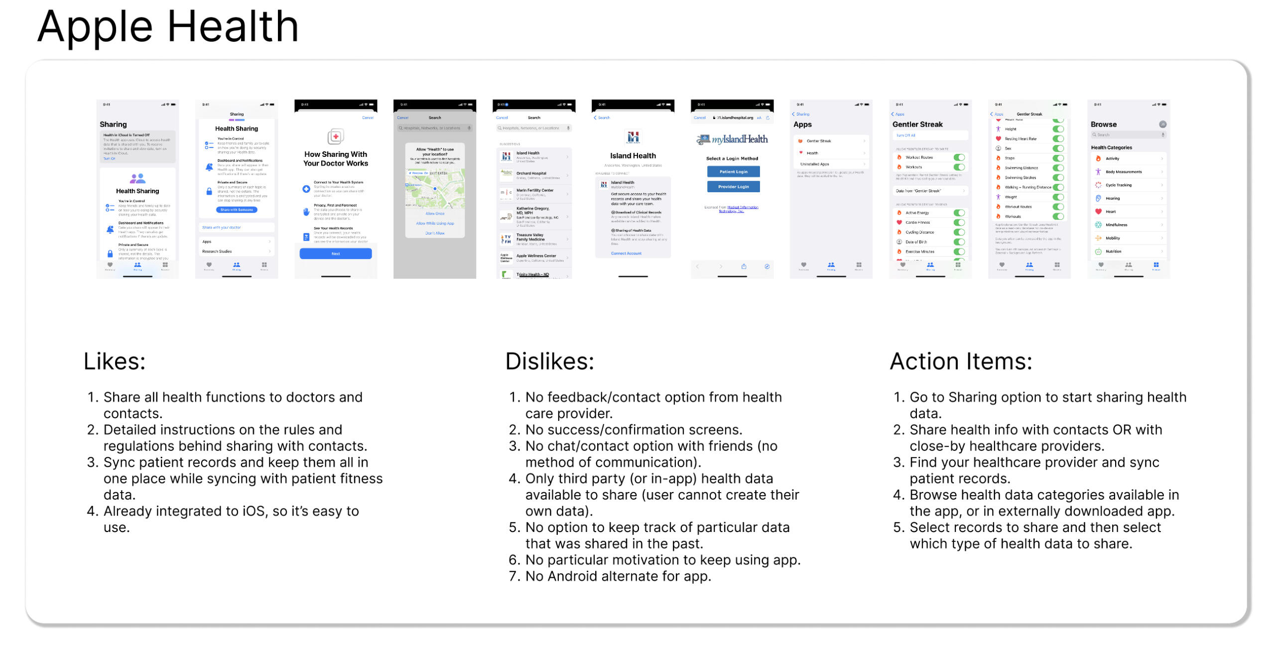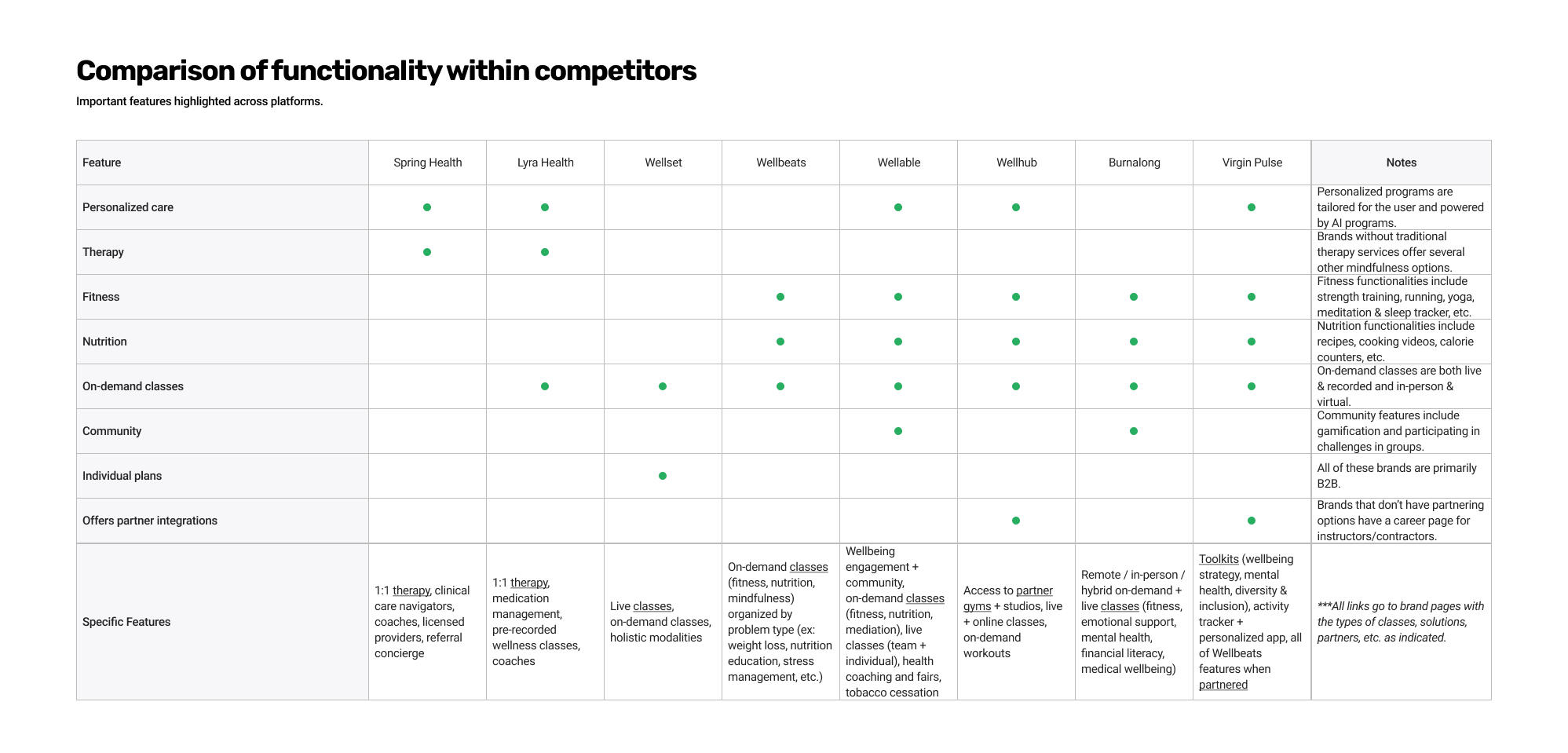 I conducted a heuristic evaluation of the existing dashboard and performed a competitive analysis of 8 similar wellness platforms that offer similar features. I also collaborated with the internal researcher to identify common pain points and note accessibility concerns. The summarized competitive analysis is given to the right.