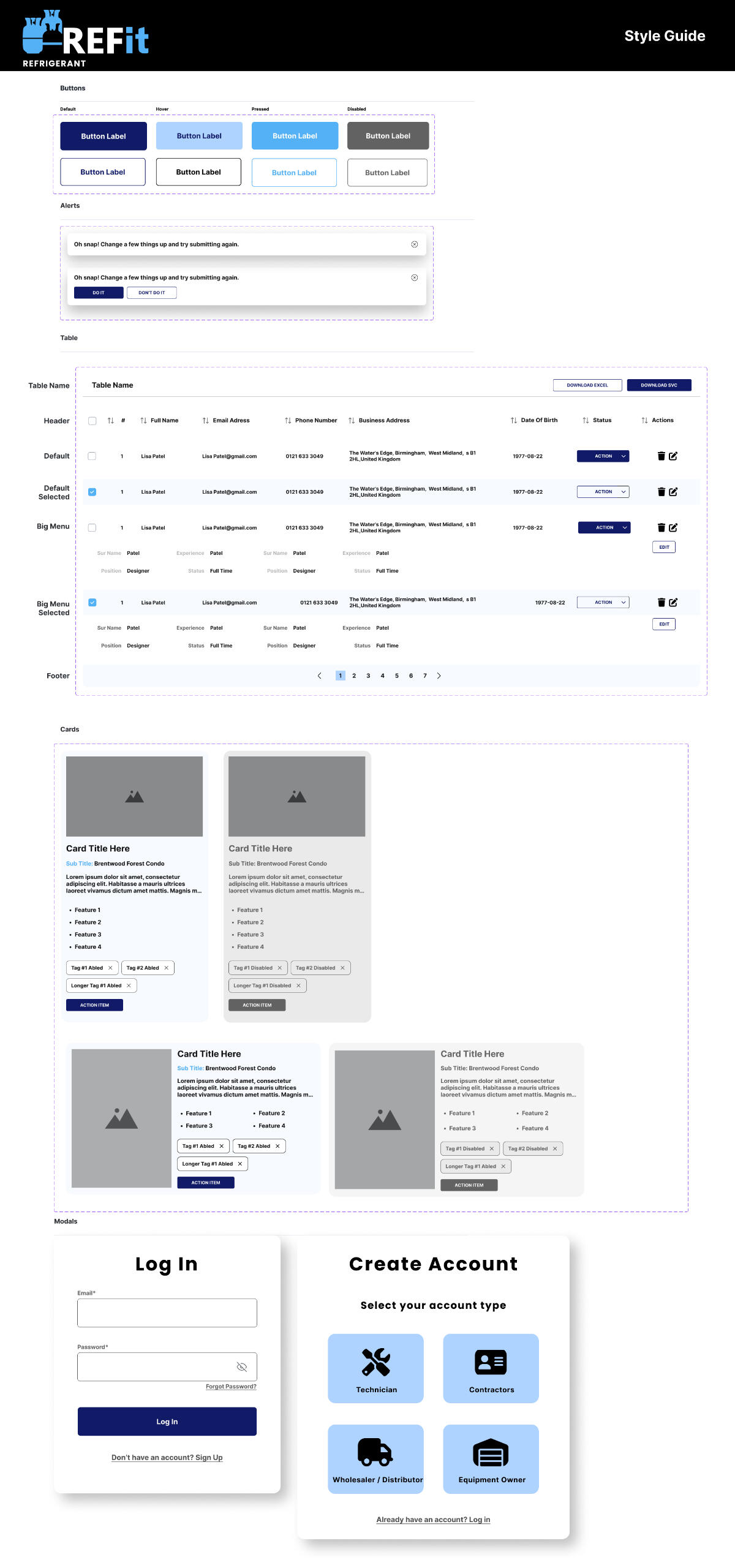 Our final deliverable was a comprehensive and detailed style guide on Figma. We included items that would be necessary in the website, including color palettes, fixed typography, and components like dropdowns, text fields, primary navigation menu, check boxes, radio buttons, pills, various button styles, tables, alerts, cards, modals and icons. We also made most of these components with nested auto-layouts so it would be easily scalable and adjustable. I also included a color accessibility check for the color palette and text for easy reference. We used these components to build our hi-fi mockups. The complete and final style guide is the image below.