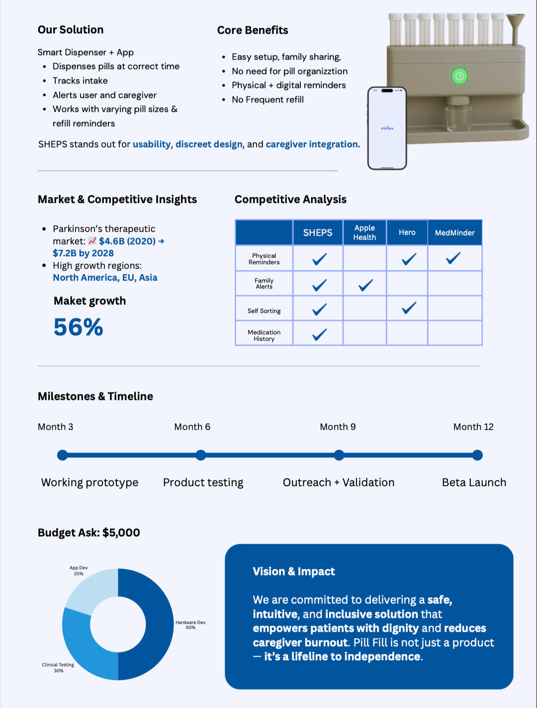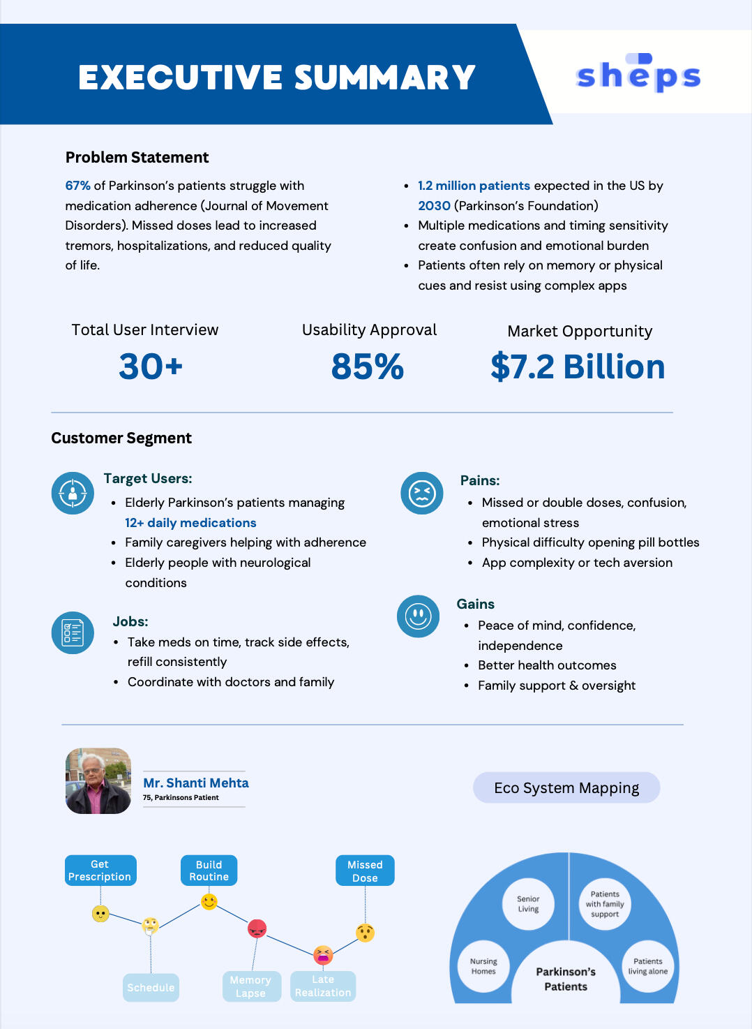 This project was developed through a team collaboration for the Social Innovation Startup Lab (SISL) course at Arizona State University. Our challenge centered on patient safety, and through in-depth research, we focused on creating a socially impactful solution to improve medication adherence among elderly Parkinson’s patients. Collaborating with a cross-functional team of four other professionals, I led the mobile app design and contributed to user research, system mapping, and product strategy. What began as a systems innovation exercise evolved into a startup solution rooted in empathy, accessibility, and real-world impact. Below is the executive summary from our final pitch presentation, highlighting our research, product concept, and market potential.